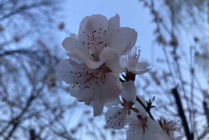 山桃花开花也较早,颜色淡粉,花期为3~4月。山桃属于不太容易辨认的花,很多人会把它误认为樱花。山桃花的特征是花贴着梗长在树枝上,也就是说几乎看不到什么花梗。