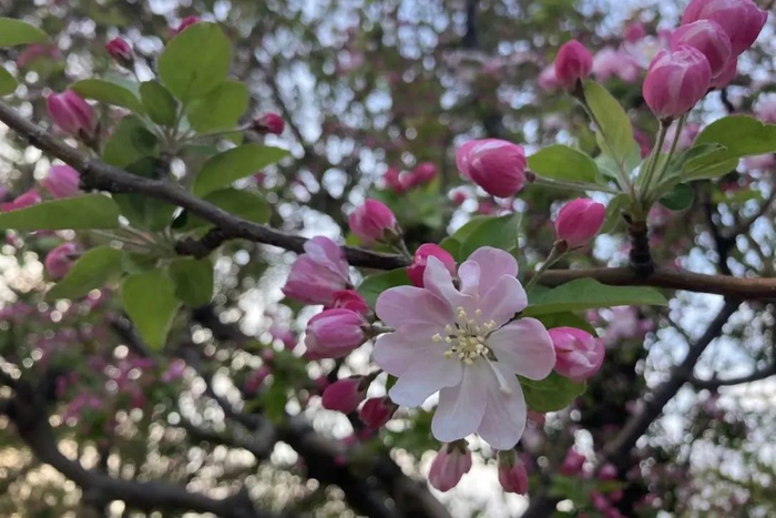 海棠品种也有很多,一般4月开放。常见的西府海棠初开时白里透粉,后期颜色变淡,有如褪色。海棠开花时有很多叶子,较容易辨认。