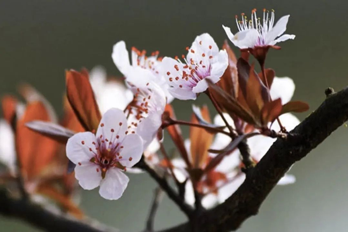 紫叶李花是白色略带一点粉色,它的特征是,开花的时候叶子是紫红色,或者说是红铜色。花期为4月。