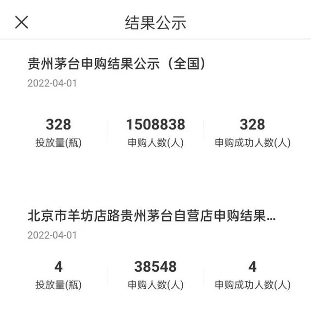 4月1日,某款茅台酒申购结果公示。
