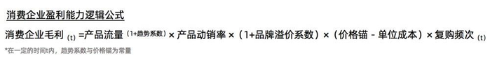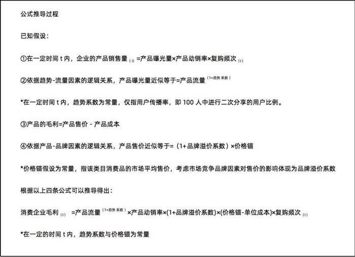 本文提出的TTPBRC模型是指通过分析Trend趋势、Traffic流量、Product产品、Brand品牌、Re-purchase复购、Cost成本等6大因素剖析消费企业获得市场的核心竞争力,并推导出核心公式阐明消费企业盈利能力和TTPBRC模型的关系: