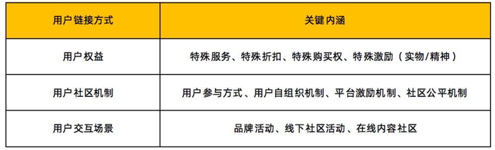 在【用户链接方式】层面,主要指的是品牌与用户的交互过程和用户与用户之间的交互过程,具体分为用户权益、用户社区机制和用户交互场景三个维度来展开,关键要素陈述详见下方表格。