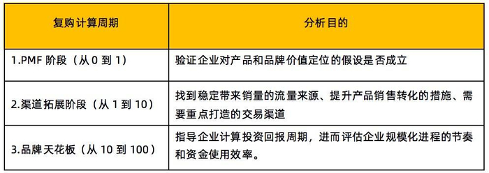 笔者提倡依据企业的发展阶段对用户复购频次进行计算,三个阶段分别对照从0到1的PMF阶段、从1到10的渠道拓展阶段和从10到100的品牌天花板阶段,不同阶段的复购频次能直接反映企业获得市场的竞争力强弱。