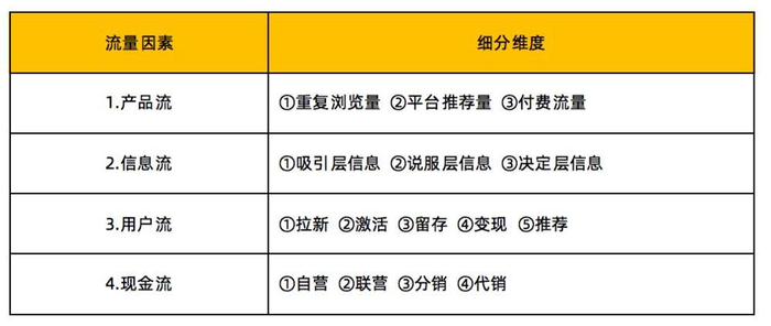 在【产品流】方面,关键是计算企业的产品是通过什么通路触达到多大量级的消费者,主要的流量分类是自然流量、推广流量、用户流量。