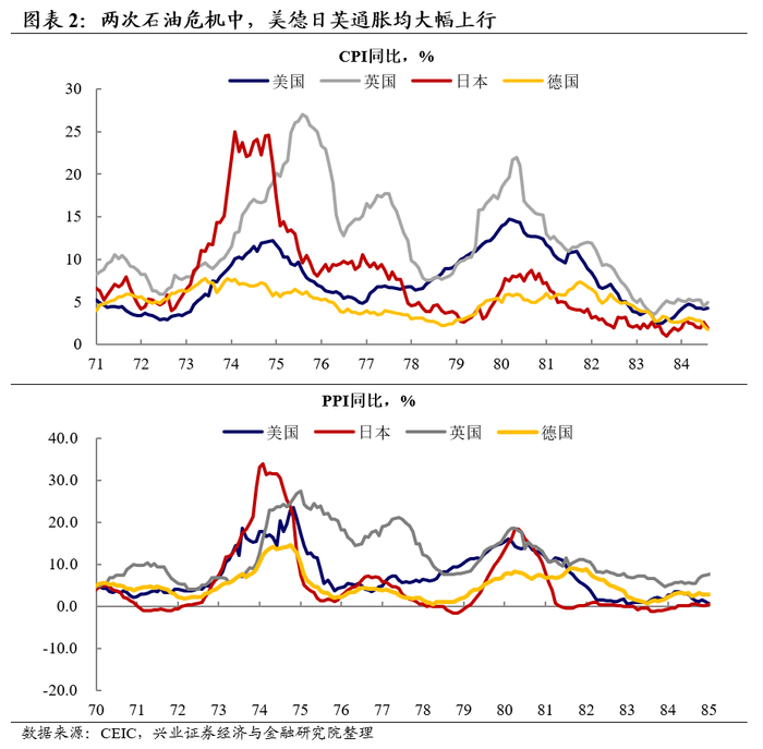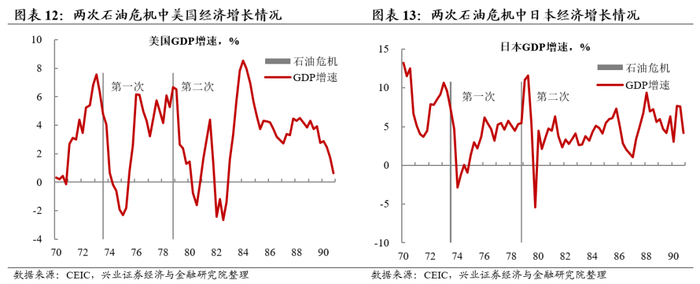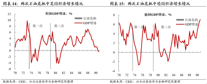第一次石油危机中,由于日本、英国通胀较高,且自身存在产能过剩、金融体系泡沫等问题,美国、德国表现好于日本、英国;
