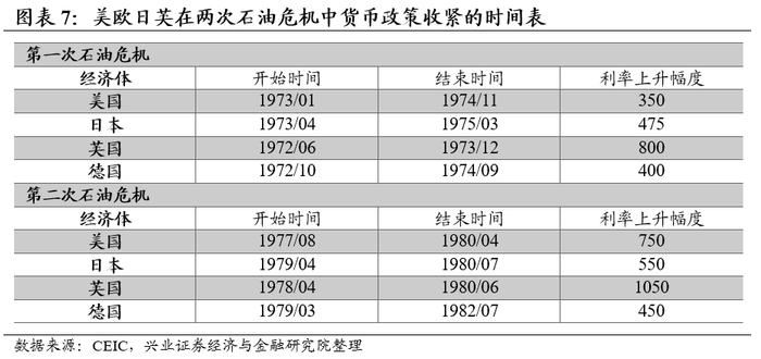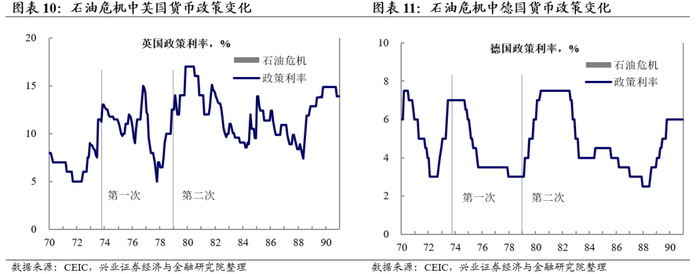 通胀飙升后,各国货币政策均出现收紧。通胀启动之后,尽管实际GDP增速都出现大幅下降,但各国均通过加息、减少货币供给等方式控制通胀。货币政策收紧的程度与通胀受影响的程度是正相关的。在第一次石油危机中,英国和日本的基准利率上升幅度最大。而在第二次石油危机中,英国和美国的基准利率上升幅度最大。