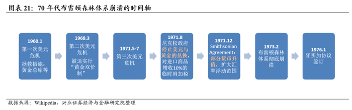 一个不可忽略的背景:布雷顿森林体系的瓦解。要讨论70年代两次石油危机时期汇率的变化,一个不可忽略的背景是布雷顿森林体系的瓦解。1944年7月,布雷顿森林协定的签订结束了二战后散乱的货币局面,此后布雷顿森林体系较为平稳的运行了15年,但也逐渐累积了潜在风险。1960年至1971年期间爆发了多次美元危机,动摇了布雷顿森林体系的根基。1971年8月,尼克松政府开始停止美元与黄金的兑换,12月,Smithsonian Agreement签订,部分货币对美元升值,并扩大汇率浮动范围。但这只是延长了布雷顿森林体系残喘的时间,直至1973年2月布雷顿森林体系彻底崩溃。