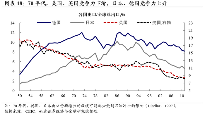 德国虽没有经历明显的转型期,但70年代末期直至80年代初期基本上是日本、德国经济是起到了全球主要产品(除原油)出口国的作用,其相对竞争力处于历史巅峰时期【3】。