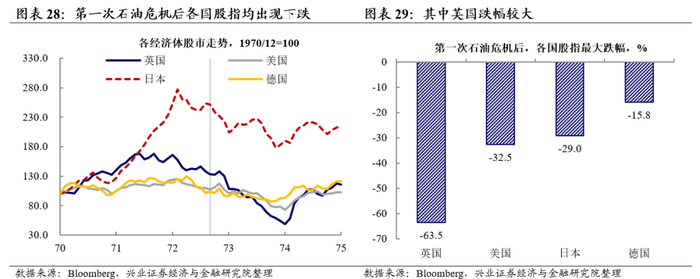 第一次石油危机中,各国股指均下跌,英国、日本的跌幅较大。与其受到危机冲击大,通胀高,经济下行相对更大有关;
