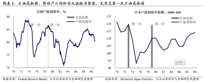 石油危机爆发前,各国通胀已有上涨的迹象,源于产品的供给不足。在第一次石油危机前,美国产能利用率已接近90%,而日本的产能利用率也处于历史较高水平。换句话说,发达经济体的产品供需状况本身就处于较为紧张的状态。