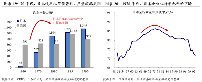 日本:二次转型成功,节能型产品助推国际竞争力。70年代第一次转型(列岛改造计划)失败,又经历第一次石油危机剧烈冲击。危机后,日本企业均采取了“减量经营”的策略,即减少利息负担、增加自有资本的比率,降低商品库存、减少雇佣工人、抑制新的生产能力扩张、采取低能耗的经营方式。同时,第一次石油危机油价暴涨使得全球对于节能型产品的需求上升,而日本国内采取的节能型发展战略也使得其产品在节能方面较其他经济体更为优越,因而日本产品在全球受到追捧,以汽车和家用电器为代表。1980年,同等耗油1加仑的前提下,日本小型汽车可行驶26英里,而美国汽车不到20英里。低能耗使得73年后日本汽车的国际需求上升,这一期间日本汽车的产量开始超越美国。同时,70年代末开始,日本电子类产品也开始崛起,对美出口增速较其他产品明显上升。而在这一期间,低技术含量的产业(如纺织机、棉纺织物)逐步褪去日本主要出口产品的身份。