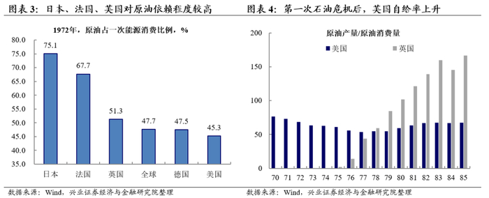 第一次石油危机中,由于日本和英国能耗高大量依赖石油进口,禁运导致两国通胀受油价飙升影响更大;