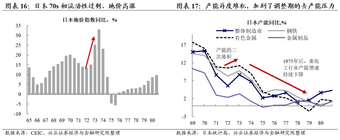 70年代初日本正好经历第一次转型失败。为应对“伊奘诺景气”后期经济下滑,日本推出“列岛改造计划”以弥补需求不足。1972年田中角荣提出《日本列岛改造论》(进行大规模的国土开发,建设新的地方城市),但是这一规划却使得银行放贷失控,股市地价高涨。日本传统行业的产能增速本来随着“伊奘诺景气”的结束在1971年就开始下滑。但1972年开始的列岛改造计划却使得产能再次堆积,钢铁、有色金属、金属制品等重化工行业的产能增长再度加速。这导致当石油危机冲击到来时,日本出现严重的商品滞销、生产缩减,大量企业倒闭(企业倒闭数在1974年达到空前的11681家)。