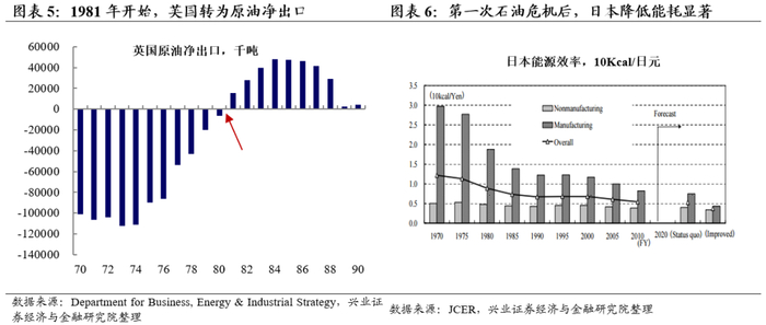 第二次石油危机中:英国、日本受冲击程度都较第一次下降,相对而言美国通胀上升幅度大于第一次石油危机。原因在于:1)1971年,英国在北海相继发现包括布伦特油田在内的众多大型油田,这使得英国原油的自给率大幅上升,从1981年开始英国已经从净进口变成净出口;2)日本则是在降低能耗,开发节能型产品方面有较好的进展,1970年至1980年间日本的能耗下降约30%。
