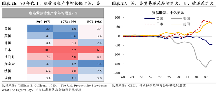 两个更为直接的数据可以印证这一点。1)这一期间劳动生产率的增长情况,从图表26可以很明显的看出,日、德的劳动生产率增速明显快于美、英;2)70年代开始,全球贸易的不均衡开始出现并逐步扩大。美、英的贸易逆差趋势扩大,而日、德的贸易顺差也同时逐步扩大。其中,英镑自1976年开始相对美元升值也源于其基本面在“跌深后的反弹”,同时原油产量上升使得其贸易逆差有所收窄。