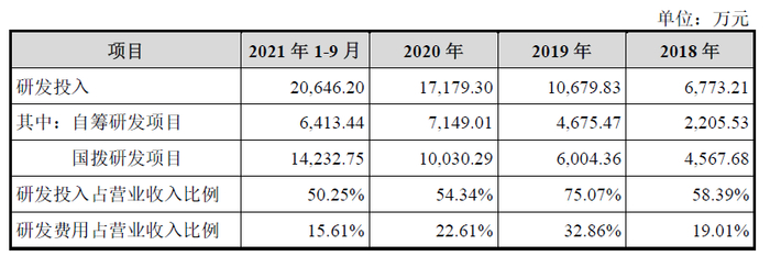 由于近年来先后承接多项国家及地方的重大科研项目,成都华微先后收到国拨研发项目专项款金额6405万元、1.14亿元、1.04亿元。加上自身研发支出,公司整体研发投入近三年营收占比分别为58.39%、75.07%、54.34%,在同行中处于较高位置。