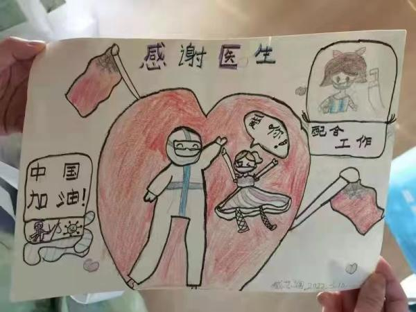 这样的“惊喜”不止一处,4月1日,护士劳泽翊手消完,刚准备给一位小姑娘采样时,小女孩悄悄从背后递上来一幅画,嘴里说:“谢谢你们,辛苦了。”目送小女孩一家人离开后,暖意却在心中久久荡漾。