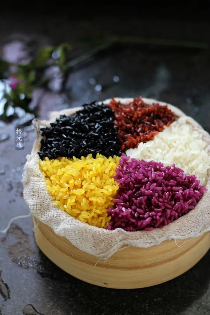广西的稻米产量更大,当地壮族、侗族清明节会吃五色糯米饭。同一种糯米,分别用红蓝草、黄花、枫叶、黄栀子、黄姜等天然色素染色而成,搭配各种鱼类肉类,预示五谷丰登年年有余。此外,还要用糯米酿酒、做甜酒发糕;用糯米磨成粉做粉蒸肉;用糯米粉加入鼠曲草做暖菇包……