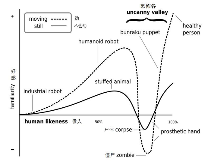 恐怖谷图示,像活人却不是活人的东西会引发恐惧 | Wikipedia