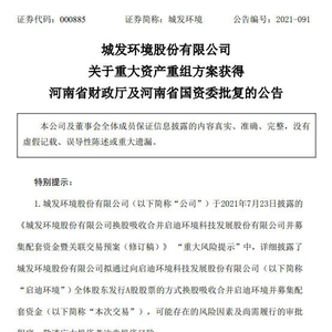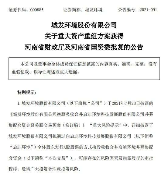 城发环境发布公告称,公司拟通过向启迪环境全体股东发行A股股票的方式换股吸收合并启迪环境并募集配套资金有关事项,已获得河南省财政厅和河南省政府国资委批复。