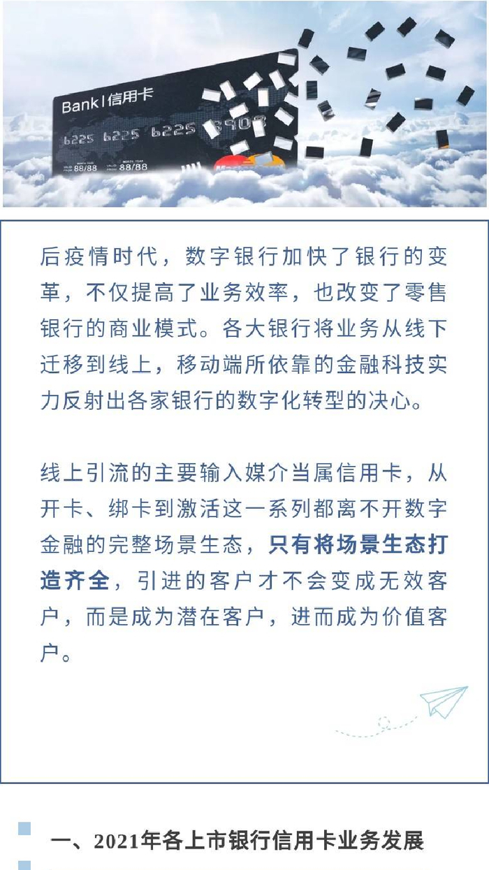 2021年以来,随着疫情后的消费复苏、国内经济逐渐回暖、央行取消信用卡透支利率上下限管理等政策出台,信用卡的各项指标不断提升。