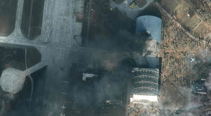 2022年2月27日,卫星图像显示了乌克兰霍斯托梅尔安东诺夫机场发生的空袭,并造成机库受损。