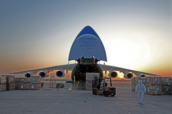 2020年4月13日,安-225运输机在天津滨海国际机场装载抗疫物资。