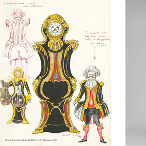 左:迪士尼电影《美女与野兽》(1991)概念图,约 1989 年,彼得·J·霍尔(美国,1926-2010);右:安德烈-查尔斯·布勒 (法国,1642–1732)设计的带底座的时钟。