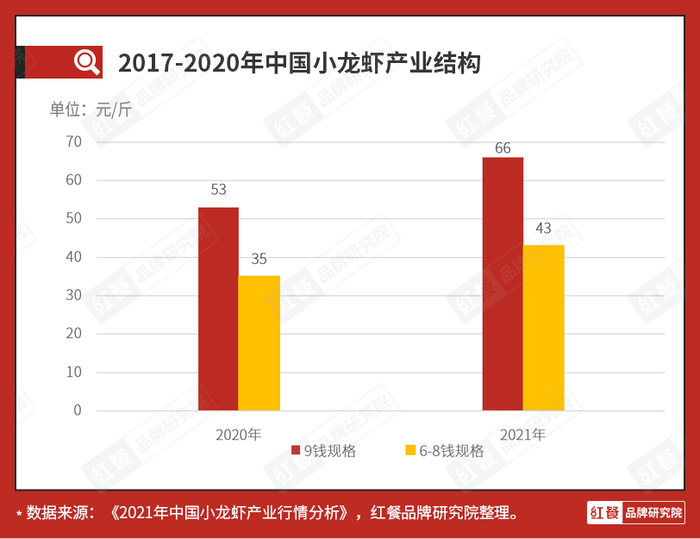 以潜江中国小龙虾交易中心数据为例,潜江市9钱规格的小龙虾2020年平均价格为53元/斤,2021年平均价格为66元/斤,上升了24.5%;6-8钱规格小龙虾2020年平均价格为35元/斤,2021年平均价格为43元/斤,上升了23%。