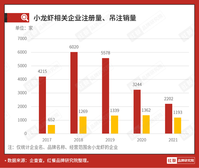 最近两年小龙虾品类的创业热情也被打入冰窟。数据显示,自疫情以来,小龙虾相关企业的注册量大幅减少,2021年的注册量为2202家,仅为2018年新注册量的三分之一。