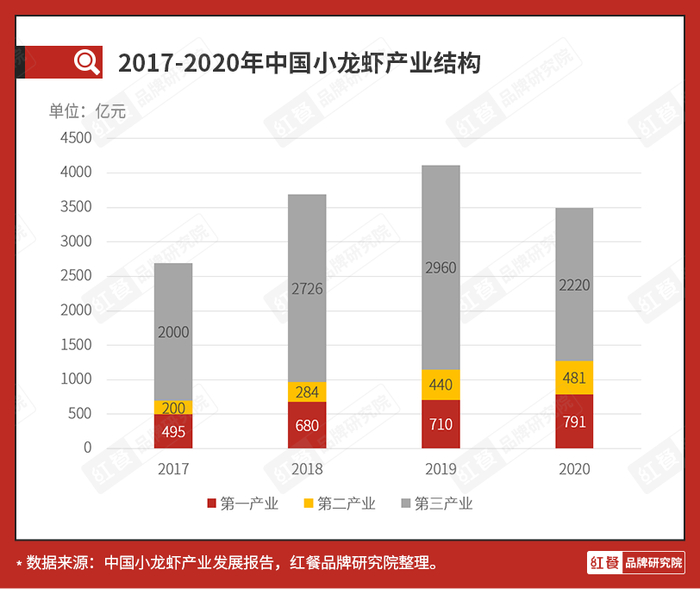 其中,小龙虾养殖业产值约为748.38亿元,同比增加11.35%;以加工业为主的第二产业产值约为480.08亿元,同比增长9.11%;受新冠肺炎疫情冲击,以餐饮为主的第三产业产值约为2220亿元,同比下降25%。