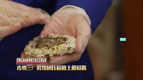 将饭团压扁放上蘑菇酱