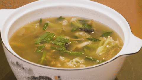 水温七成热下锅,加入花菜、木耳、鸡精、盐、酸笋、青蒜煮制完成后,即可出锅;