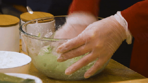 将打成汁的鼠曲草放入碗中,加入糯米粉、盐揉光滑后用保鲜膜封口,放置一旁醒发10分钟;