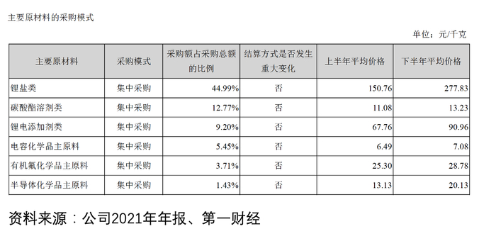 2021年公司主要原材料的采购模式显示,碳酸酯溶剂和锂电添加剂的采购额仅占采购总额的12.77%、9.20%,而锂盐类的采购额占采购总额的比例高达45%。