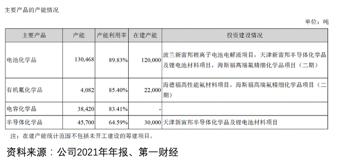 截至2021年末,公司已形成13.04万吨电池化学品、4082吨有机氟化学品、3.84万吨电容器化学品以及4.57万吨半导体化学品产能。