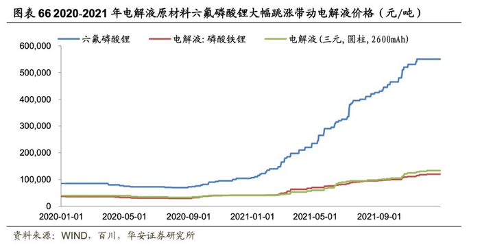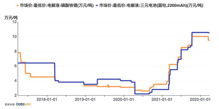 通联数据datayes!显示,2021年1月1日-2022年3月28日,磷酸铁锂、三元圆柱电池电解液市场最低价分别增长了171.43%、275%。