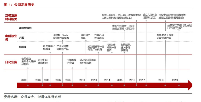 2007年,天赐材料引进Dr.Novis Smith六氟技术,开始产业化销售电解液产品;2013年,六氟技术投入市场,公司成为国轩高科等电池厂的电解液主要供应商;2014年,公司成功上市并持续拓展客户,于2015年收购东莞凯欣电池材料有限公司(2019年注销,东莞凯欣业务已转至公司及其子公司宁德凯欣),打入宁德时代供应链。