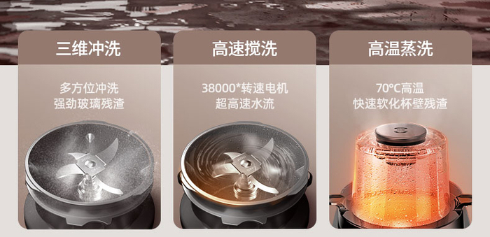 不用动手,更不需要拆开刀座,出浆后自动进入清洗程序,三维冲洗+高速搅拌+高温蒸洗,别提多省心了!