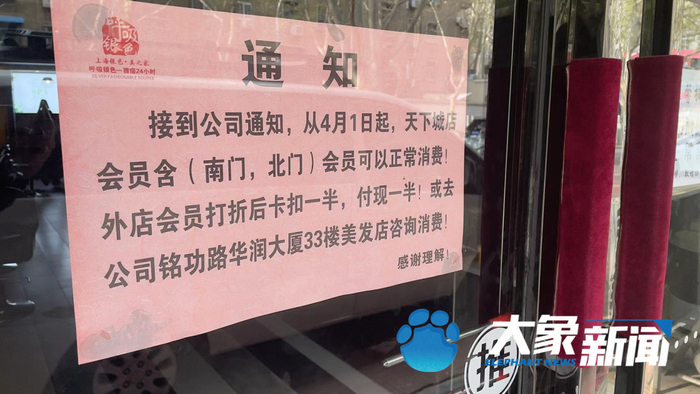 随后,大象新闻记者又按照银色·美之家天下城店张贴的通知,前往位于铭功路华润大厦的门店,“现在只有在这家店才能用卡里的钱全额消费,其他的店都不行。”该店员说。