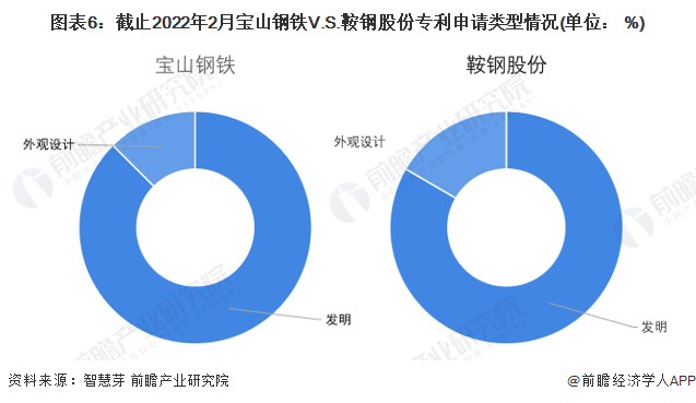 宝山钢铁和鞍钢股份废钢专利申请类型以发明专利为主。宝山钢铁及鞍钢股份发明专利占比均在80%以上。