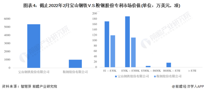 (2)专利市场价值对比:宝山钢铁专利市场价值更高