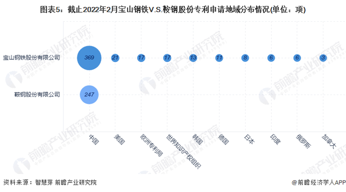 目前,宝山钢铁及鞍钢股份废钢专利申请区域均主要集中在中国,在中国申请的废钢专利数量分别为369项、247项。