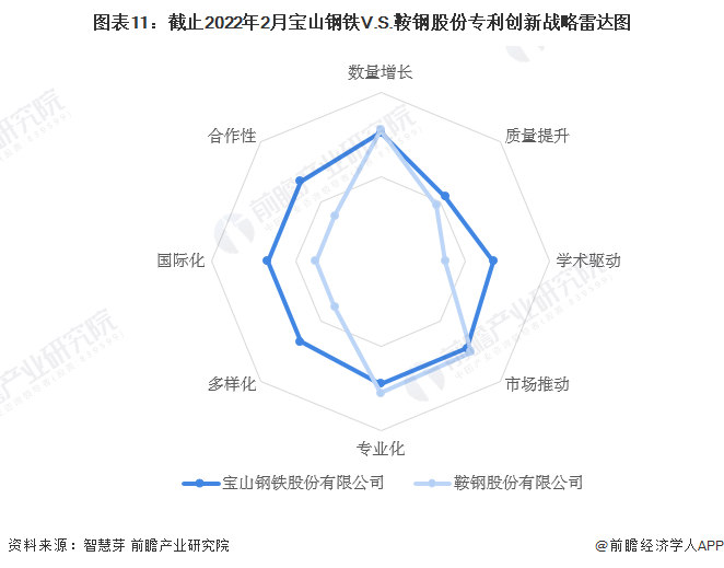 整体来看,宝山钢铁废钢技术在合作性、国际化、多样化、质量提升以及学术驱动等方面具有相对竞争优势,鞍钢股份废钢技术则在专业化、市场推动上具有相对竞争优势,两者废钢技术在数量增长方面相当。