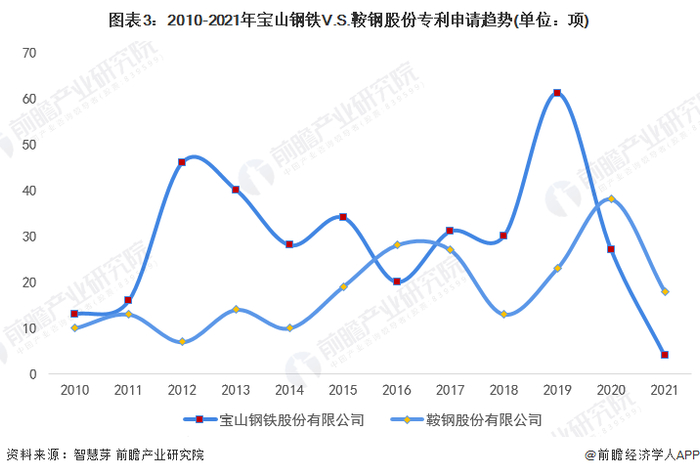 从趋势上看,2010-2020年,鞍钢股份在废钢领域专利申请量基本比宝山钢铁少。2021年,宝山钢铁废钢专利申请量为4项,鞍钢股份废钢专利申请量为18项。