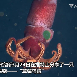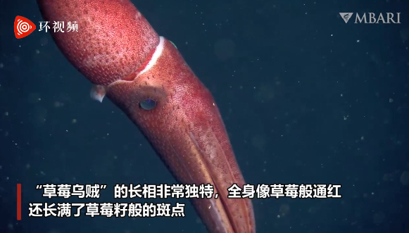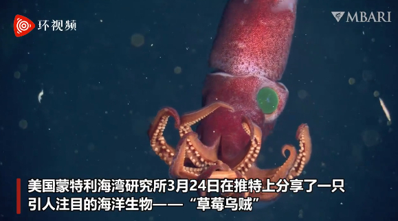 美国蒙特利海湾研究所(MBARI)3月24日在推特上分享了一只引人注目的海洋生物——“草莓乌贼”,这只乌贼不仅全身呈现草莓般的红色,还长满了草莓籽般的斑点,在黑暗的深海中慢慢游动。
