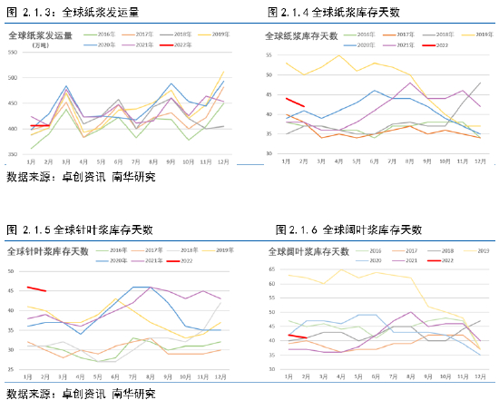 从全球纸浆发运量来看,根据最新数据显示,2022年1月全球纸浆发运量为405.9万吨,相比于2021年同期下降了4.2%。全球纸浆库存天数,针/阔叶浆库存天数较去年同期都有所上涨。