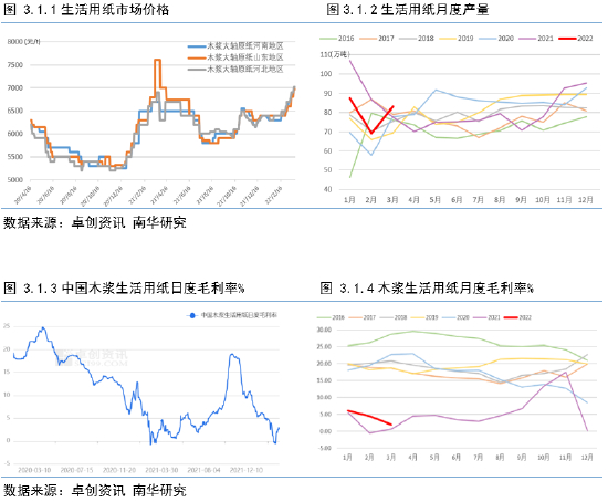 截至3月末,生活用纸市场均价在6872.02元/吨,较2月整体月均价上涨约295.46 元/吨,上涨幅度 4.49%;较去年同期走高181.8元/吨,涨幅约2.72%。其中木浆生活用纸月度均价在 6942.86 元/吨,较2月份走高6.57%。总结市场价格变动因素,第一,成本面动力延续,月内进口木浆价格延续高位运行。第二,部分纸企积极推进涨价函落地,局部地区部分厂家出厂价格月内多次上调。第三,3月份华东、西南等地部分纸企轮停检修,优先去库,利好涨价函落实。但目前可以观测到,生活用纸价格虽有所上涨,但不及上游成本端涨价显著,原因一个是终端方面仍未见明显提 涨动向,加工厂利润继续承压,一定程度上制约原纸的涨幅;另一个是国内近期疫情反复,本月下旬局部地区发运不畅,个别偏高喊价暂乏有效实单跟进。展望二季度,4月份生活用纸行业属于传统淡季,终端需求回暖程度或难言乐观;上游浆价受供应消息影响在相对高位,成本支撑延续,预计4月份生活用纸市场波动有限,局部地区不同品质原纸存在窄幅价差。5-6 月份市场淡季氛围或难消散,观望电商渠道年中促销节点,下游备货力度如何,若终端利好不足,则不排除纸价在竞争格局中下行的可能。