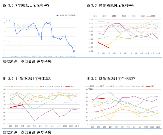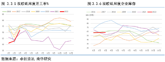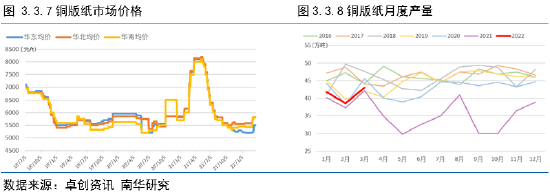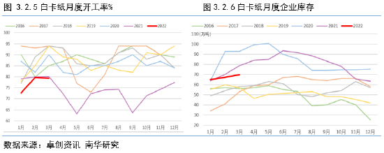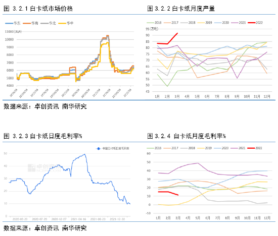 截至3月末,250-400g 平张白卡纸市场成交含税月均价6351.67元/吨,较上月涨 4.23%,较去年同期下跌 33.92%。至月底主流品牌市场价格区间 6300-6600 元/吨。影响本月价格走势的原因:第一,原料纸浆高位震荡,整体成本增加,纸厂价格3月提涨 200 元/吨,并计划4月提涨300元/吨;第二,中上旬市场到货量不大,渠道货源有限,随着运费上涨以及到货成本提升,贸易商出货价格陆续上调;第三,国内需求偏弱,同时中下旬多地物流运输不畅减缓市场出货速度,部分市场有价无市,但纸厂原纸出口订单较好对国内供应压力增加起到较好的缓解作用。展望二季度,4月纸厂价格继续提涨,在纸浆高位运行支撑下将推进市场涨价的执行,出口订单或将保持稳中有增趋势。但从目前形势看,下月国内市场需求受季节性因素及物流等 方面影响成交偏弱,下游对于涨价接受度一般,预计纸价继续上行存阻力。5-6 月份,山东地区将有30万吨左右的新增投产计划。受国内疫情影响,医药等行业订单旺盛,后续需关注医疗及防疫相关物资对白卡纸的需求情况。
