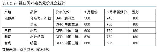 外盘报价方面,2022年1月份北美市场木浆外盘陆续提涨,提涨幅度在40-65美元/吨,木浆外盘坚挺,纸厂后期外盘成本面压力居高不下,市场观望气氛浓郁。进入2月,Suzano、Eldorado 3月份全球市场外盘提涨30美元/吨,受海运紧张及加拿大当地物流因素影响,发货延迟情况未有明显改善。3月底最新阔叶浆外盘涨 60-105 美元/吨,部分净价在780美元/吨;针叶浆3月份加针已公布 外盘提涨110-170美元/吨,4月份俄罗斯依利姆、Arauco银星外盘提涨100美元/吨。